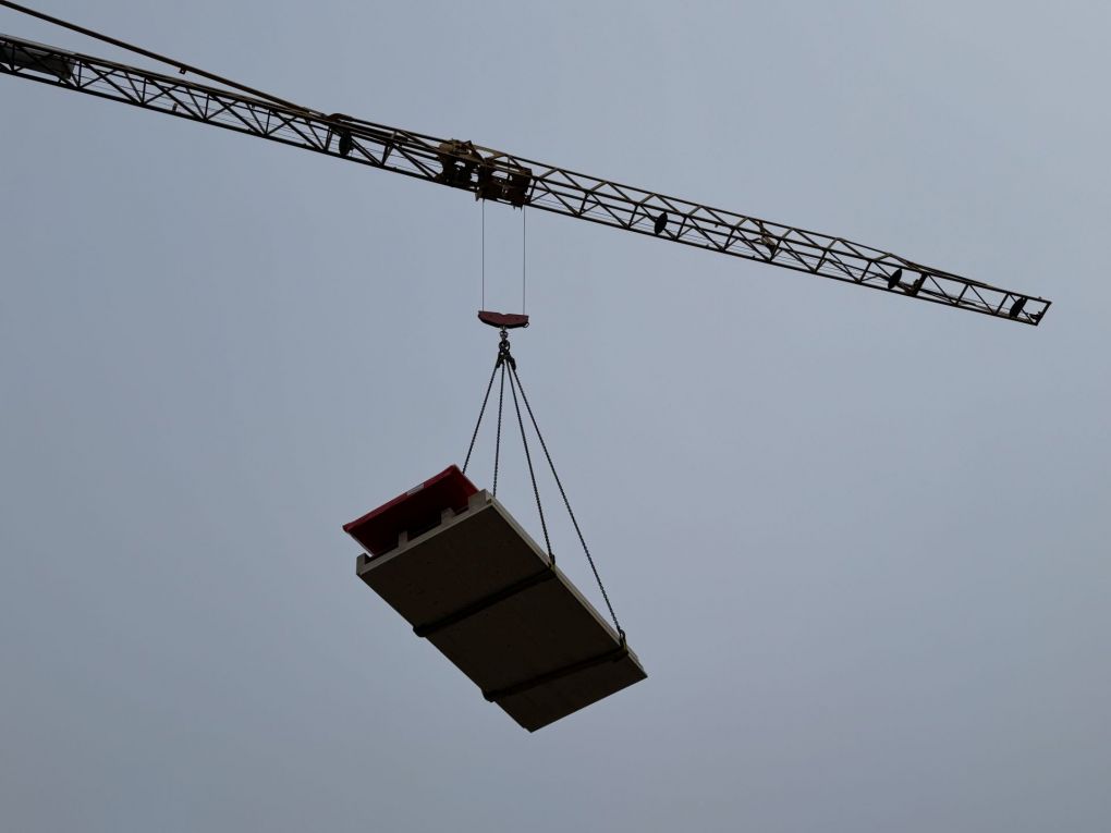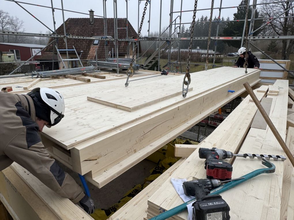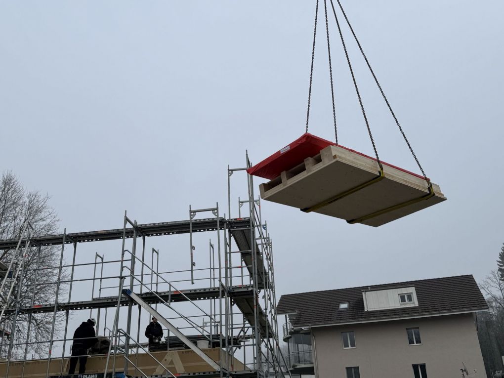 Plötzlich ging es schnell: Bei Schmid & Co Holzbau AG wurden die Fertigbauelemente zu zweit verladen und anschliessend nach Riedholz transportiert. Am Montag geliefert, am Mittwochabend waren die Elemente auf dem Sockel fix montiert. Gerade noch rechtzeitig, bevor der Regen kam...