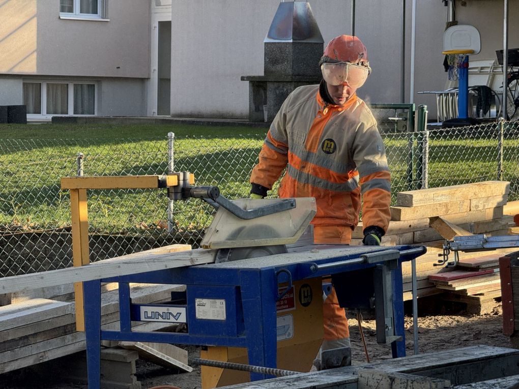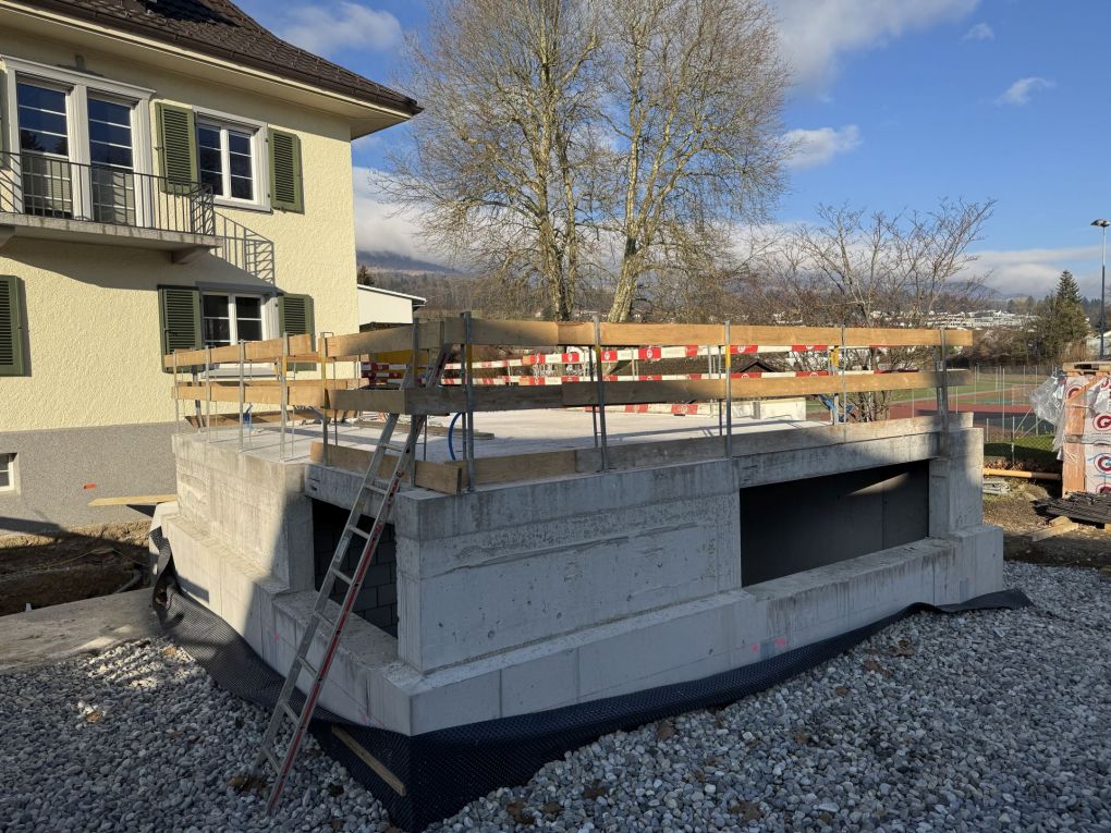 Es wird fleissig für das nächste Jahr gearbeitet: Im Aussengelände wird ein Massivsockel aus Beton vorbereitet, worauf dann im Januar die Fertigbauelemente angebracht werden. Innenseitig wird der Treppenkern aufgezogen und mittels Stahlkonstruktion verstärkt.