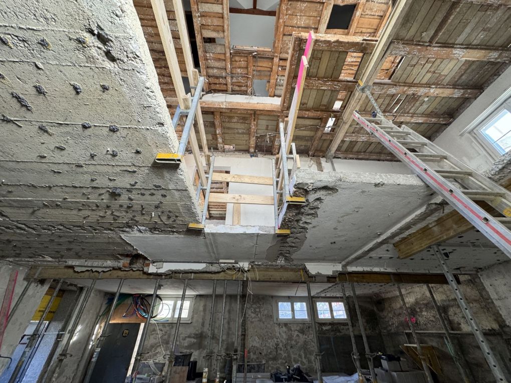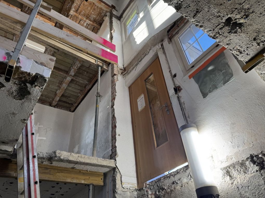 Bei der Besichtigung im März standen die Betonierungsarbeiten der neuen Treppen im Bestandsgebäude im Fokus. Schritt für Schritt nach oben: Während die Treppen in den Keller und ins Obergeschoss bereits betoniert und begehbar waren, war der Aufgang ins Dachgeschoss noch frisch gegossen. Einen bleibenden Fussabdruck wollten wir dann doch nicht riskieren…